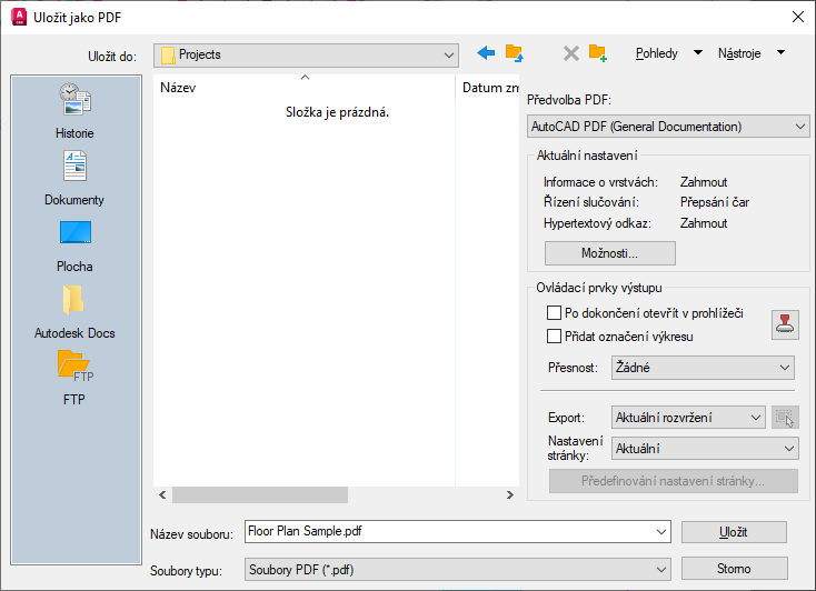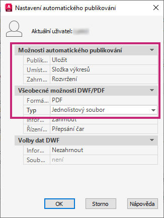 Poznámka: Automaticky publikované soubory PDF, DWF nebo DWFx automaticky přepisují existující verze se stejným názvem.