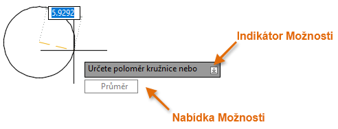 Tato ikona označuje, že jsou k dispozici další možnosti. Kliknutím na šipku dolů nebo stisknutím klávesy se šipkou dolů při vyzvání k zadání poloměru se zobrazí nabídka s možností Průměr. Výběrem možnosti Průměr můžete místo hodnoty poloměru určit průměr kružnice. Když se zobrazí nabídka, můžete se pohybovat dostupnými možnostmi stisknutím kláves se šipkami dolů a nahoru nebo ukazovacím zařízením.