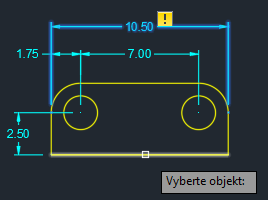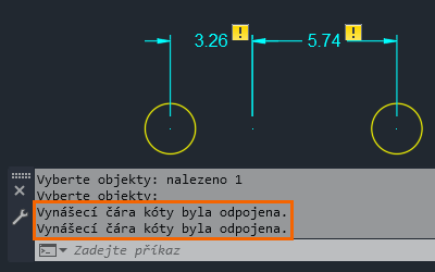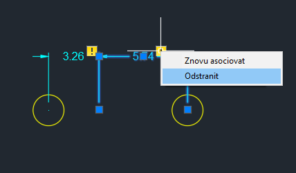 U kót se zobrazí žlutý indikátor, který značí, že již nejsou asociovány s kružnicemi. Odstraněním prostřední kružnice se vytvořily dvě kóty bez asociativity.