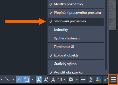 Pokud tlačítko Sledování poznámek na stavovém řádku nevidíte, klikněte na možnost Přizpůsobení