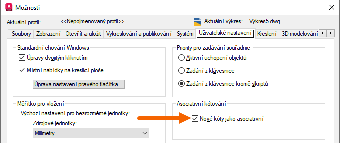 Ve výchozím nastavení jsou všechny nové kóty asociativní. Toto chování je možné změnit v dialogu Možnosti.