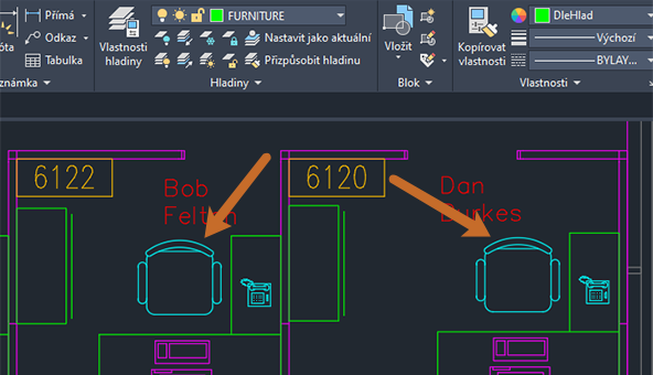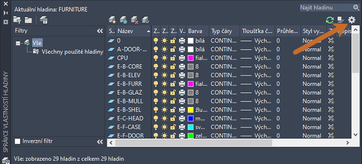 Předpokládejme, že chcete nastavit hladinu FURNITURE jako aktuální. Samozřejmě můžete jednoduše otevřít seznam hladin a posouvat se, dokud nenajdete hladinu FURNITURE. Místo toho však pomocí příkazu Nastavit jako aktuální rychle změníme aktuální hladinu.