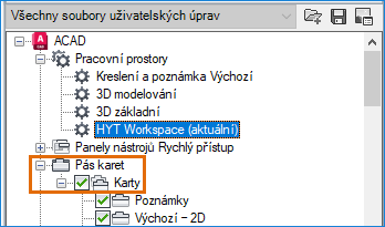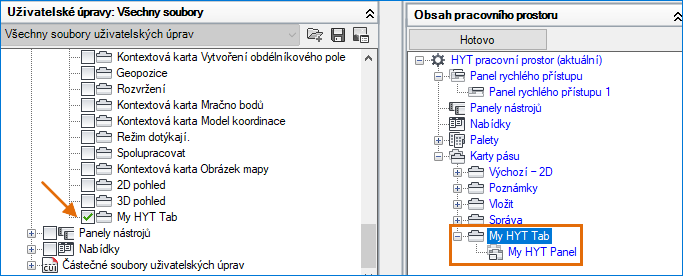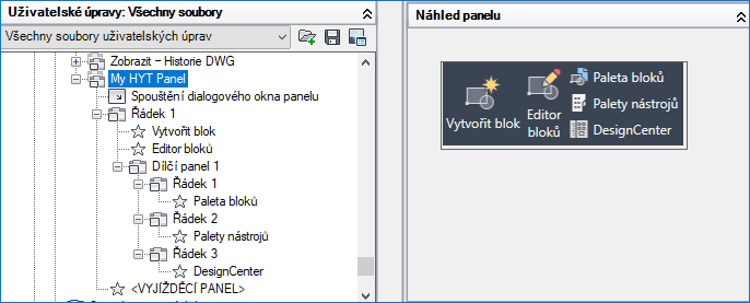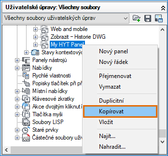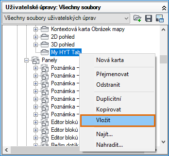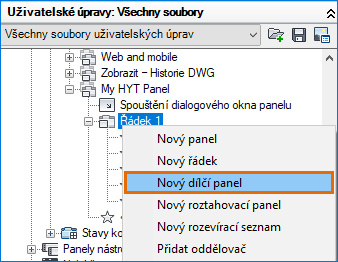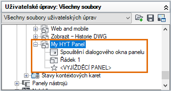 V případě potřeby vyhledejte v Editoru CUI nově vytvořený panel pásu karet (My HYT Panel).