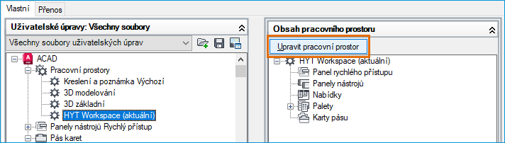 V Editoru CUI, na kartě Vlastní klikněte v podokně Uživatelské úpravy: <název souboru> na znaménko plus (+) vedle uzlu Pracovní prostory, čímž jej rozbalíte.
