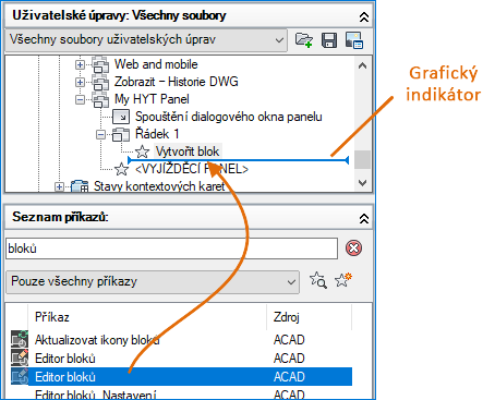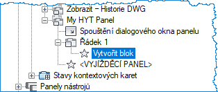 V podokně Seznam příkazů zadejte do textového pole Seznam příkazů výraz blok. Vyberte možnost Vytvořit blok (příkaz BLOK) a přetáhněte jej do pole Řádek 1 na panelu My HYT Panel.