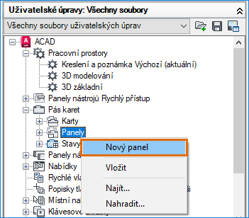 Pod uzlem Pás karet kliknutím na znaménko plus (+) u uzlu Panely rozbalte příslušný uzel.