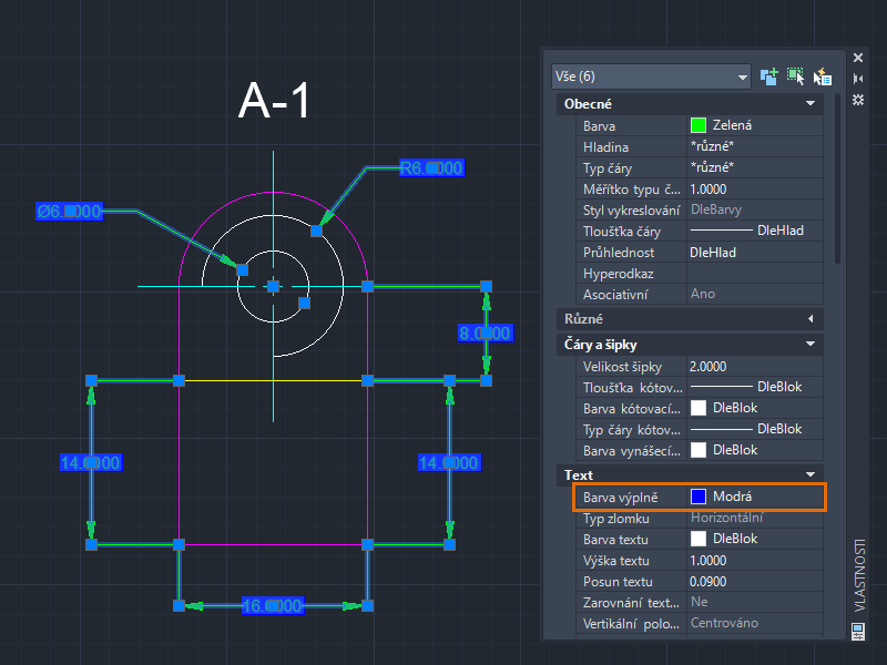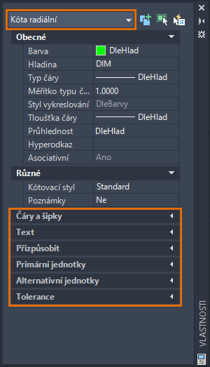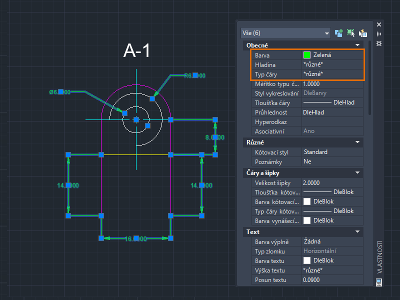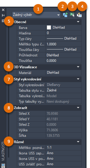 | 5 | Obecné | Zobrazí obecné vlastnosti vybraného objektu nebo nastavení aktuálního výkresu (pokud není nic vybráno). Tato část také obsahuje sadu nástrojů Hladina. |