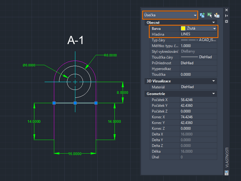 Změna vlastnosti vybraných objektů na hodnotu DleHlad převezme hodnoty vlastností z aktuální hladiny. Vzhledem k tomu, že vlastnost Barva vybraných objektů je nastavena na hodnotu DleHlad, objekty nyní zobrazují barvu definovanou hladinou ÚSEČKY.
