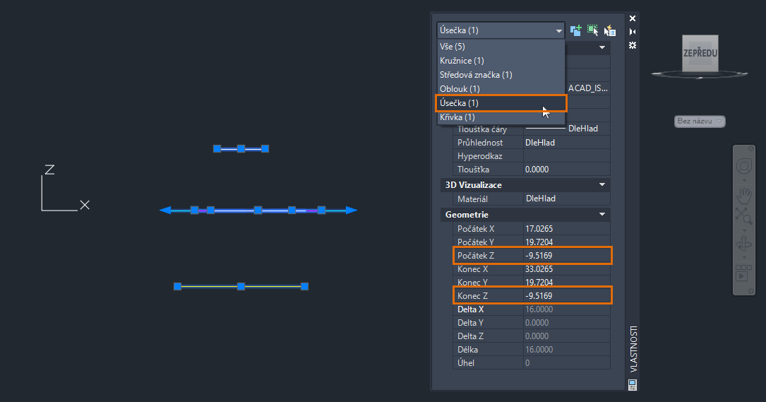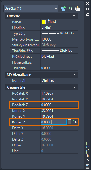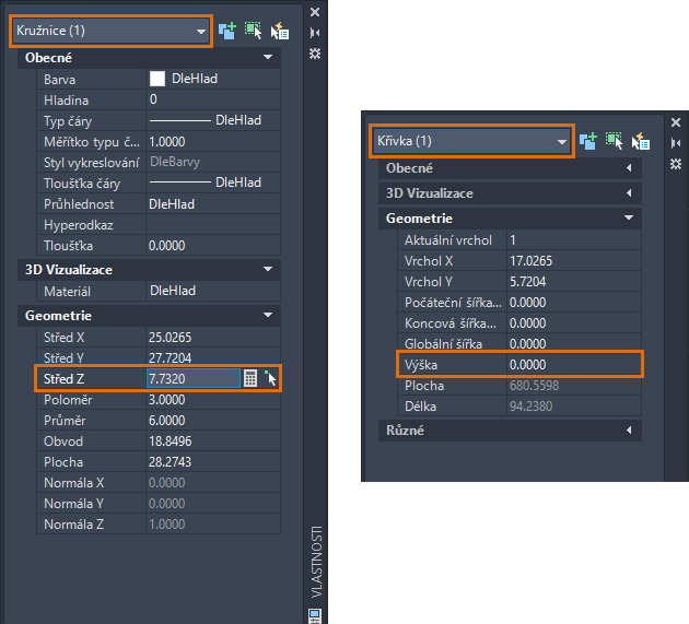 Různé objekty budou mít různé názvy vlastností hodnot na ose Z. Objekt může mít jednu nebo více následujících vlastností: Počáteční Z, Koncové Z, Pozice Z (mtext), Střed Z (kružnice) nebo Výška (křivky).