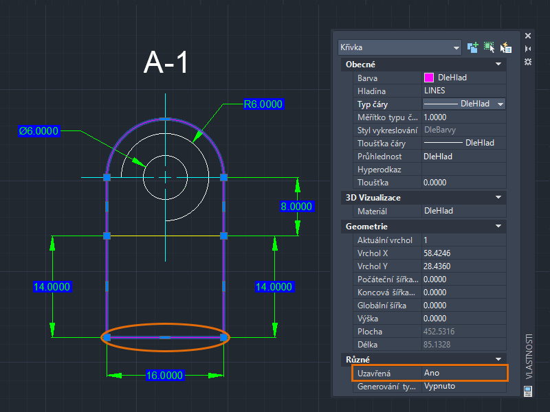 Někdy je obtížné najít a opravit malé mezery v hranicích, zejména při práci na velkých nebo složitých výkresech. Tyto nežádoucí mezery mohou bránit v tvorbě požadovaného šrafování. Pomocí palety Vlastnosti můžete snadno uzavřít (nebo otevřít) objekty, jako jsou křivky nebo křivky spline.
