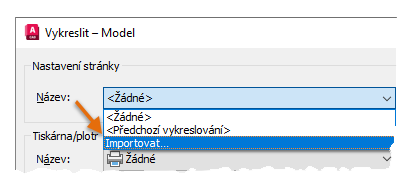 Poznámka: Počet importovaných nastavení stránek můžete snížit přidáním pojmenovaných nastavení stránek do souborů šablon výkresů. Poté je budou mít všechny nové výkresy založené na těchto šablonách automaticky k dispozici.