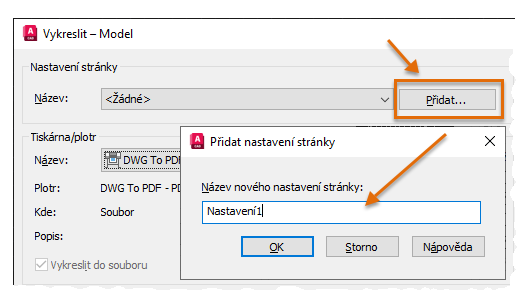 Čili jakmile se budete příště připravovat k vykreslení výkresu, klikněte před vykreslením na tlačítko Přidat a uložte nastavení stránky k budoucímu použití. Tak můžete ušetřit nějaký čas potřebný k přepnutí mezi plotrem, výstupními zařízeními a výstupem do formátu PDF. Importováním nastavení stránky využijete předchozí práci a vyhnete se možným chybám.