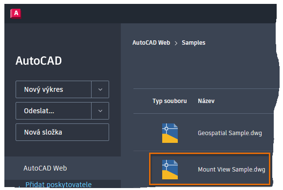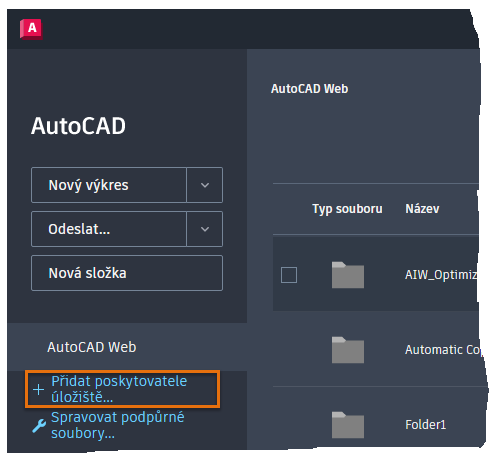 Kromě otevírání souborů výkresů, které byly uloženy do služby AutoCAD Web & Mobile, můžete přímo ve webové aplikaci AutoCAD (bez nutnosti instalace na disk) otevřít i výkresy, které byly uloženy přes zprostředkovatele cloudového úložiště třetí strany.