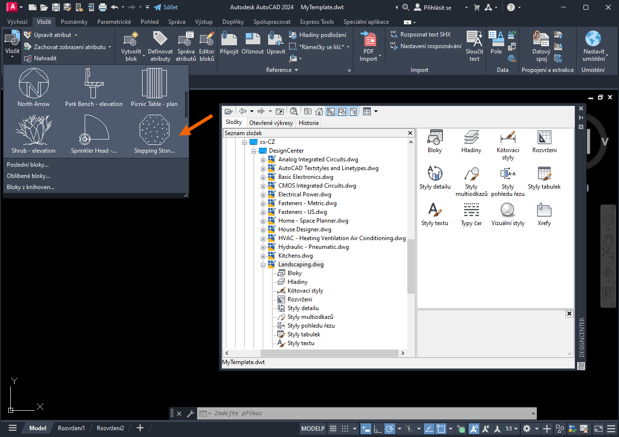 Nyní jsou v šabloně MyTemplate k dispozici pojmenované styly, bloky a nastavení výkresu, které jsou definovány v souboru Landscaping.dwg.