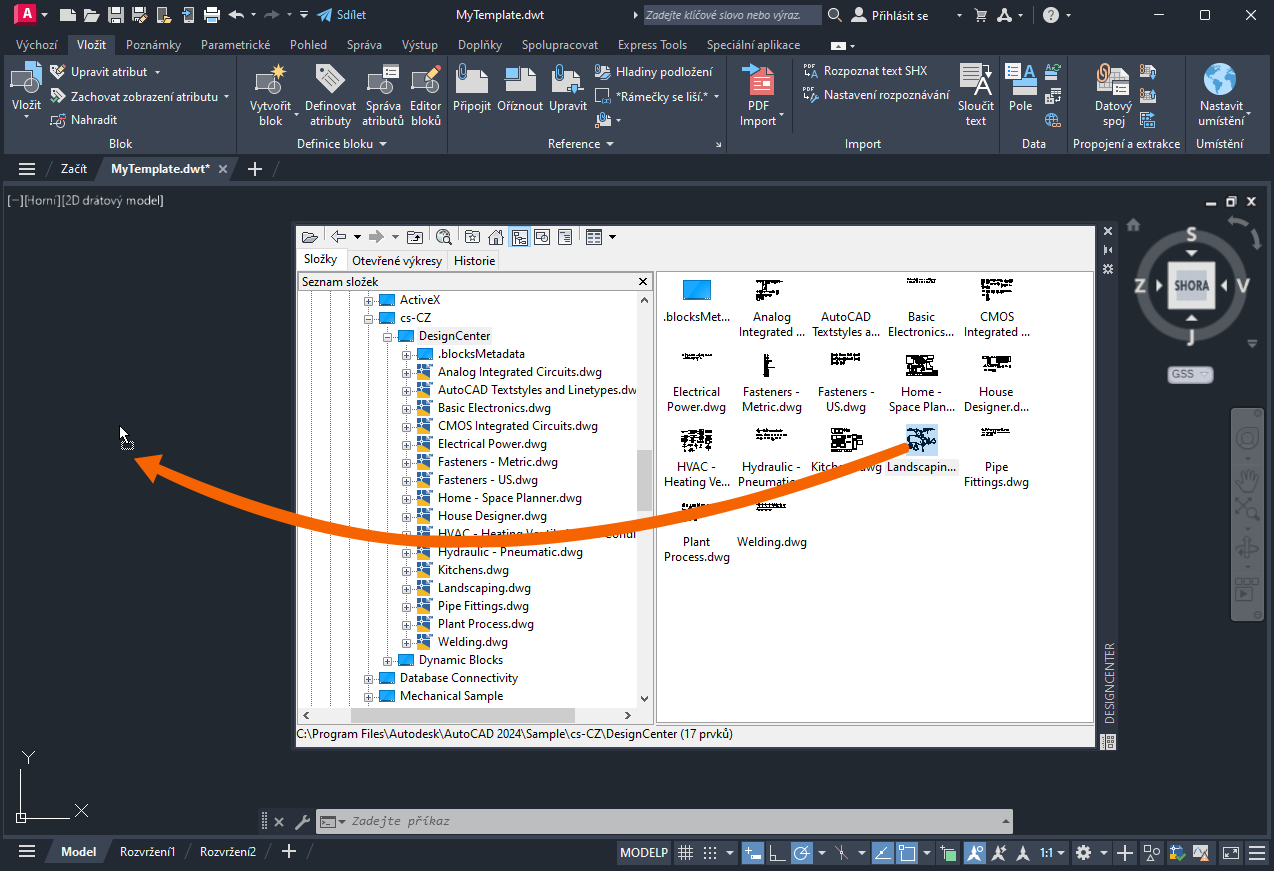 Pomocí aplikace DesignCenter lze do šablony přidat hladiny, pojmenované styly a bloky.
