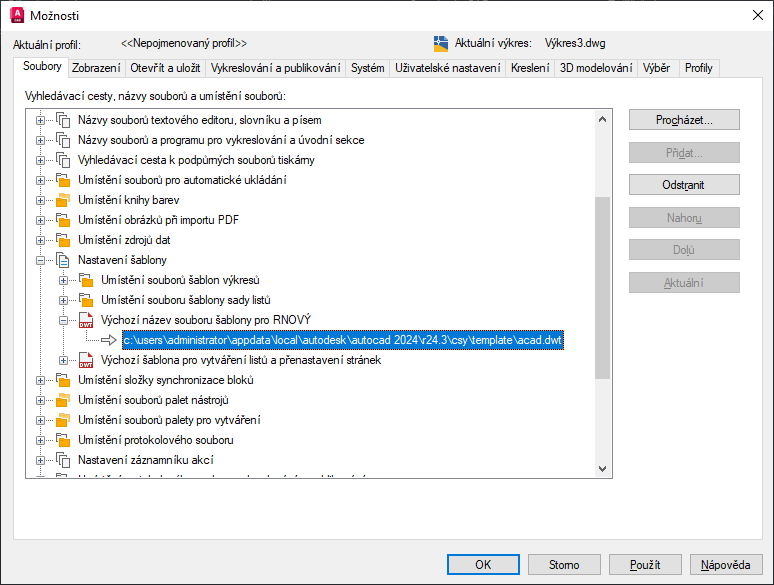 Když máte nyní vytvořenou a uloženou šablonu, začneme ji používat. Ve výchozím nastavení aplikace AutoCAD se při vytvoření nového výkresu vytvoří výkres ze šablony určené v poli Výchozí název souboru šablony pro RNOVÝ, v tomto případě acad.dwt. Změníme toto nastavení tak, aby se vytvořil nový výkres pomocí nové šablony.