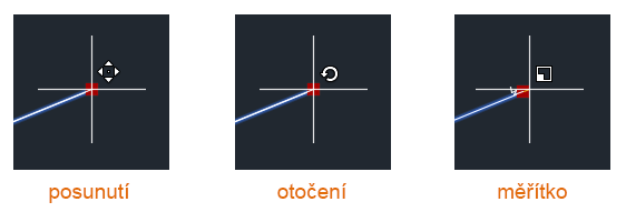 Poznámka: Indikátory kurzoru označují, že je aktivní režim uzlu posunutí, otočení nebo změna měřítka, neoznačují však režim protažení nebo zrcadlení.