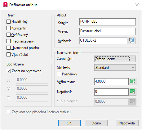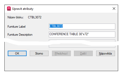 - Štítek – viditelný zástupný text, který se zobrazuje v okně výkresu před atributem přidávaným do bloku. Zadaná hodnota se používá k identifikaci atributu při extrahování hodnot z bloku.