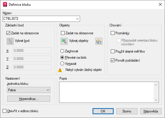 - V dialogu Definice bloku zadejte hodnoty podle následujícího obrázku:
