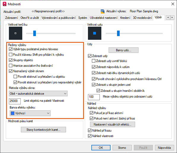 Povolit stisknutí a přetažení pro nepravidelný výběr. (PICKAUTO) Tuto možnost vypněte, pokud chcete vypnout nepravidelný výběr a následně kliknutím a přetažením vytvořit výběrové okno.