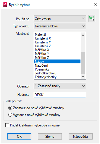 Poznámka: Volba Název odpovídá pojmenovaným objektům, jako jsou názvy bloků, ale také typu objektu pro nepojmenované objekty, jako jsou úsečky a kružnice.
