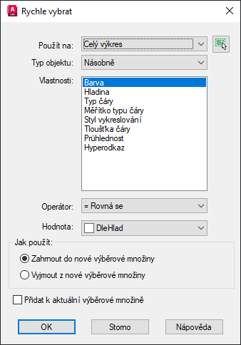 Vybráno (PICKADD=0) – při každém výběru objektů se vytvoří nová sada výběru. Pokud při výběru podržíte klávesu Shift, objekty, které jsou již v sadě výběru, budou odstraněny, a nové objekty budou přidány.