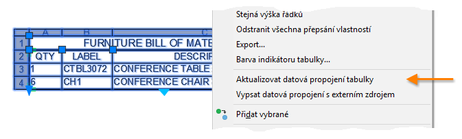 Data extrahovaná a umístěná v tabulce lze aktualizovat pomocí původních nastavení extrakce dat. Pokud například do výkresu přidáte další bloky, můžete aktualizovat datové propojení asociované s tabulkou, aby tabulka obsahovala nejnovější počty bloků. Není nutné opakovat celý proces extrakce znovu.