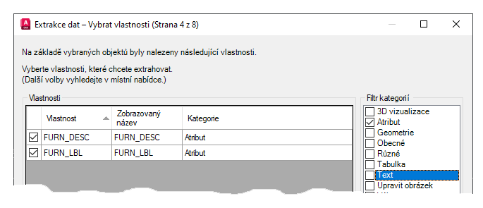 - Pod položkou Filtr kategorií zrušte výběr všech možností kromě možnosti Atribut, a pak zkontrolujte, zda zaškrtnuté vlastnosti odpovídají hodnotám atributů, které chcete extrahovat.
