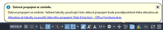 Tip: Pokud alespoň jedna tabulka ve výkresu obsahuje extrahovaná data, na oznamovacím panelu okna aplikace AutoCAD se zobrazí ikona Datová propojení. Když se zobrazí ikona, můžete kliknutím pravým tlačítkem myši na ikonu spravovat a aktualizovat datová propojení ve výkresu. Systémová proměnná DATALINKNOTIFY řídí vzhled a funkci ikony Datová propojení.