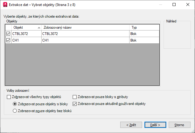 - Zrušte zaškrtnutí políčka Zobrazovat všechny typy objektů, vyberte možnost Zobrazovat pouze objekty s bloky a klikněte na tlačítko Další.