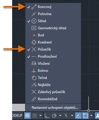 Klikněte pravým tlačítkem na tlačítko Uchopení objektu a vyberte koncový bod i průsečík, pokud ještě nejsou zaškrtnuty.