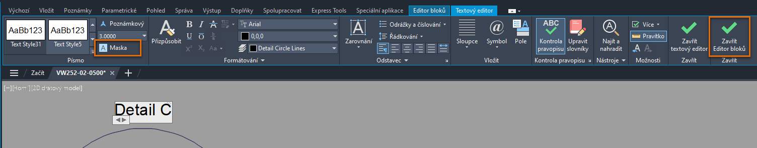 Odkaz Detail C je blok, který obsahuje víceřádkový text, u kterého chceme přidat masku pozadí.