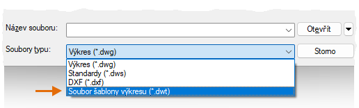 Jestliže pracujete samostatně, můžete vytvářet soubory šablon výkresu, které budou vyhovovat vašim aktuálním pracovním potřebám, a postupně k nim přidávat nastavení pro další funkce, jak se s nimi budete seznamovat. Chcete-li upravit existující soubor šablony výkresu, klikněte na tlačítko Otevřít, v dialogu Vybrat soubor vyberte položku Šablona výkresu (*.dwt) a vyberte soubor šablony výkresu.