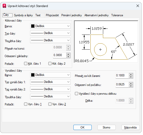 Výchozí styl kóty se nazývá Standardní (britské jednotky) nebo ISO-25 (metrické jednotky). Je přiřazen ke všem kótám, dokud jako aktuální styl kóty nenastavíte jiný styl.