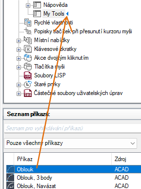 - V podokně Seznam příkazů přetáhněte příkaz, který chcete přidat do místní nabídky, do podokna Uživatelské úpravy: <název souboru>.