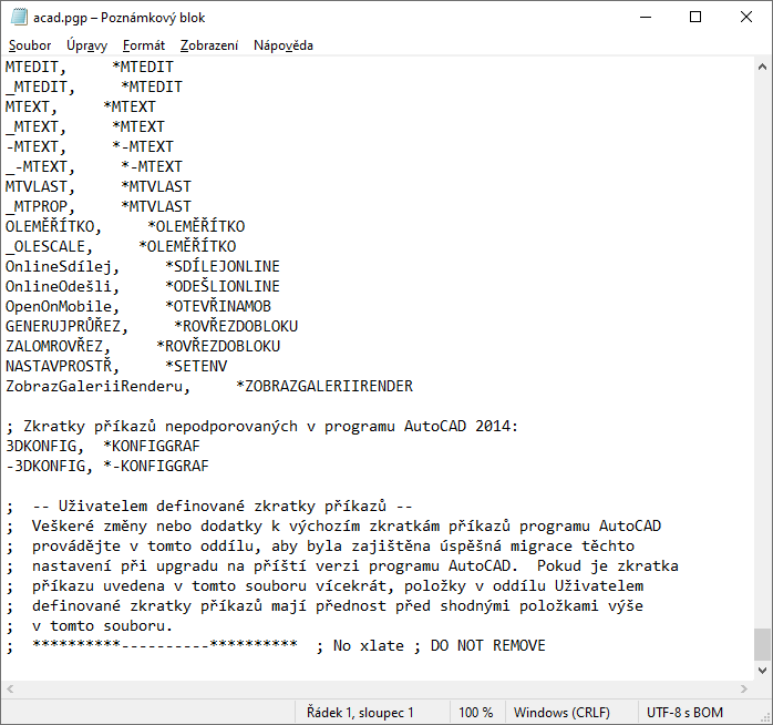 Poznámka: Změny aliasů příkazů jsou uloženy do souboru acaduser.pgp (nebo acadltuser.pgp u aplikace AutoCAD LT).