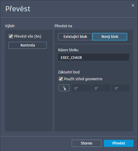 BLOKPŘEVOD – zobrazí dialog Převést a převede vybranou geometrii a identické instance na bloky.