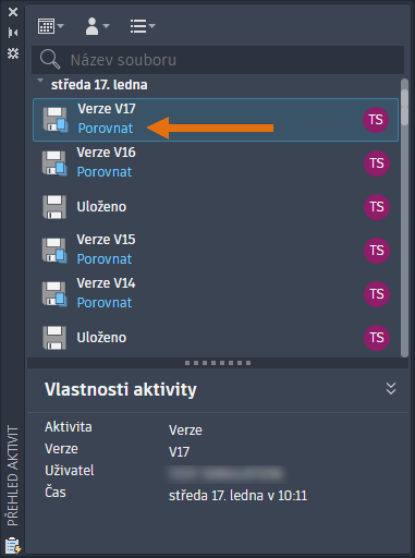 Sledujte vývoj výkresů a porovnávejte historii výkresů pomocí Přehledu aktivit, palety, která zaznamenává aktivity a filtruje je podle typu aktivity, uživatele a data.