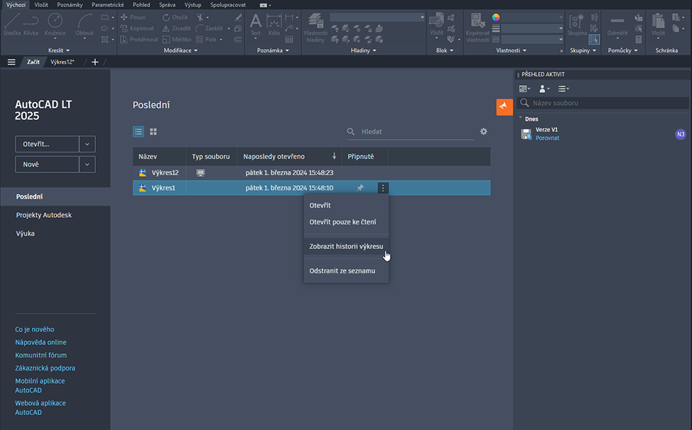 Můžete také zobrazit více verzí výkresu bez otevření souboru. Na kartě Začít klikněte na možnost Poslední a vyberte výkres. Poté klikněte na vertikální výpustku a vyberte možnost Zobrazit historii výkresu – zobrazí se aktivity výkresu na ukotvené paletě.