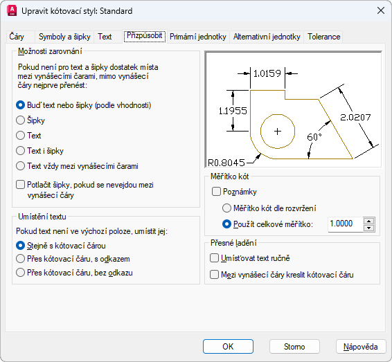 Posune buď text, nebo šipky mimo vynášecí čáry, podle vhodnosti (systémová proměnná DIMATFIT).