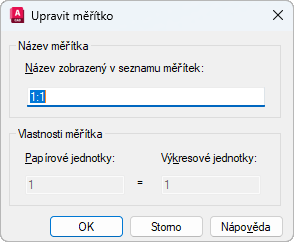 Zadejte popisný nebo číselný název. Například v architektonickém výkresu, v němž se používá typické měřítko britské soustavy, můžete zadat buď 1”=4’ , nebo 1:48.