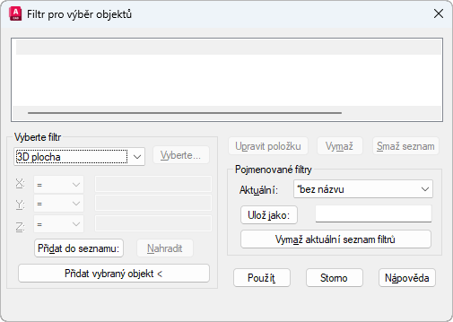 Umožňuje vybrat, upravit a pojmenovat filtry pro výběr objektů.