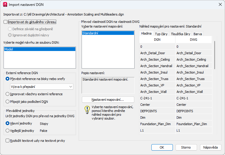 Standardním nastavením je výchozí nastavení mapování, které extrahuje data z exportovaného výkresu a používá automatické mapování hladin DGN, typů čar, tlouštěk čar a barev podle zobrazení v náhledu mapování.
