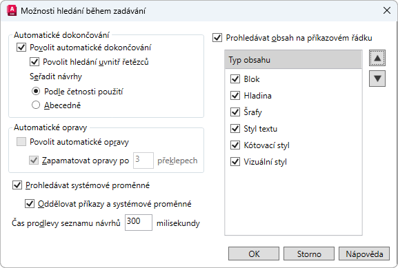 Seznam návrhů příkazového řádku umožňuje rychlý přístup k příkazům, systémovým proměnným a pojmenovaným objektům (obsahu), například blokům, zadáním části jejich názvu na příkazovém řádku. Nastavení určuje, které položky mají být zobrazeny, jejich pořadí, prodlevu před rozbalením seznamu a množství nápovědy poskytované aplikací při zadávání. Také můžete nastavit, zda seznam bude zobrazovat návrhy pouze pro příkazy a obsah začínající písmeny, která napíšete, nebo také pro příkazy a obsah, které tato písmena obsahují (vyhledávání uprostřed řetězce).