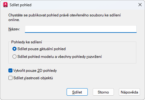 Publikuje reprezentaci aktuálního prostoru nebo celý výkres k prohlížení online a sdílení. Toto usnadní komunikaci a spolupráci s ostatními účastníky bez nutnosti sdílení zdrojových souborů DWG.