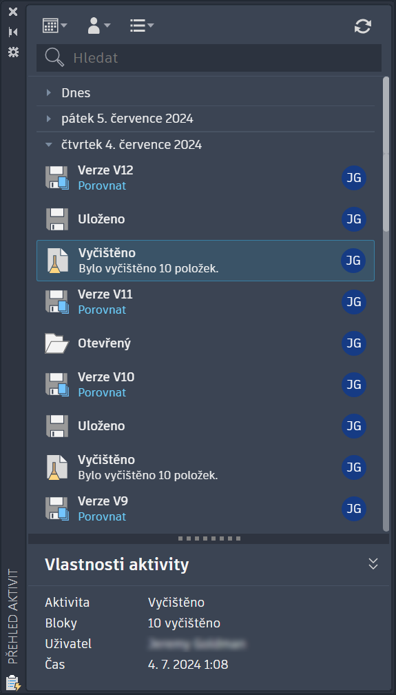 Zobrazí se paleta Přehled aktivit, na které se zobrazí aktivita aktuálního výkresu.