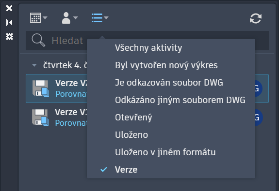 Aktivita: Rozbalte filtr aktivit. Vyberte položku v seznamu typů aktivit pro aktuální výkres.