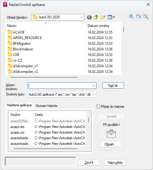 Pokud vyberete soubor, který je již načten, příkaz Načíst v případě nutnosti znovu načte aplikaci. Vypíše momentálně načtené aplikace ObjectARX. V takovém případě je nejprve nutné uvolnit aplikaci ObjectARX a potom ji znovu načíst. Možnost Načíst je také dostupná v místní nabídce po kliknutí pravým tlačítkem myši na soubor na kartě Seznam historie.