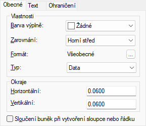 Řídí mezeru mezi ohraničením buňky a obsahem buňky. Nastavení okrajů buněk je použito na všechny buňky v tabulce. Výchozí nastavení je 0.06 (britské) a 1.5 (metrické).