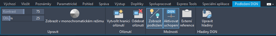 Vyberete-li ve výkresu podložení DGN, zobrazí se na pásu karet kontextová karta Podložení DGN.